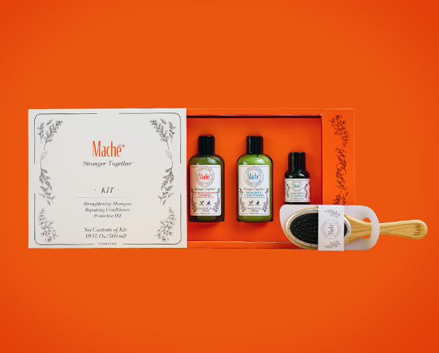 La imagen inspirada en los diseños vintage y un pantone vibrante que representa la marca, hacen a Machē una opción de productos para el cabello con las mejores fórmulas y un cepillo hecho de manera artesanal. Ilustraciones que acompañan a la identidad con un propio estilo demostrando que la marca es para cualquier tipo de pelo. Stronger Together refuerza el concepto de la rutina con los cuatro productos.
